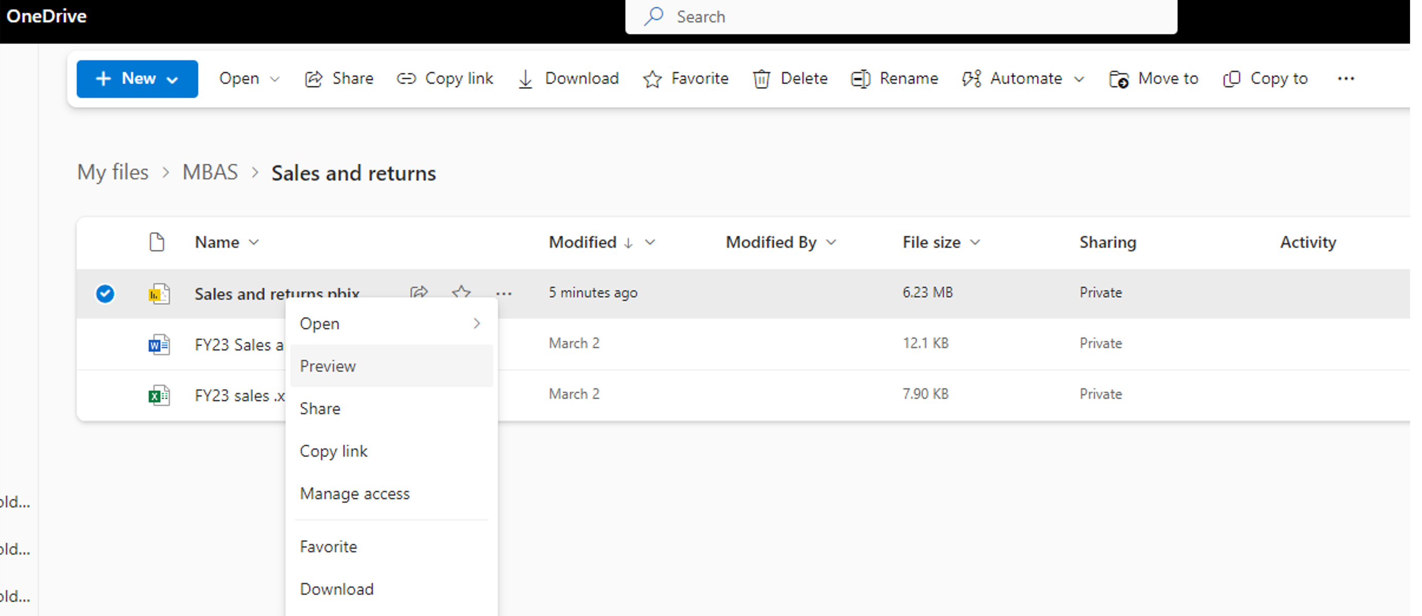 Hvis du vil have vist en Power BI-fil i OneDrive eller SharePoint, skal dataene være i importtilstand eller have direkte forbindelse til en semantisk model i Power BI-tjeneste. Filer med andre tilstande beder dig om at downloade filen for at åbne den lokalt i Power BI Desktop.