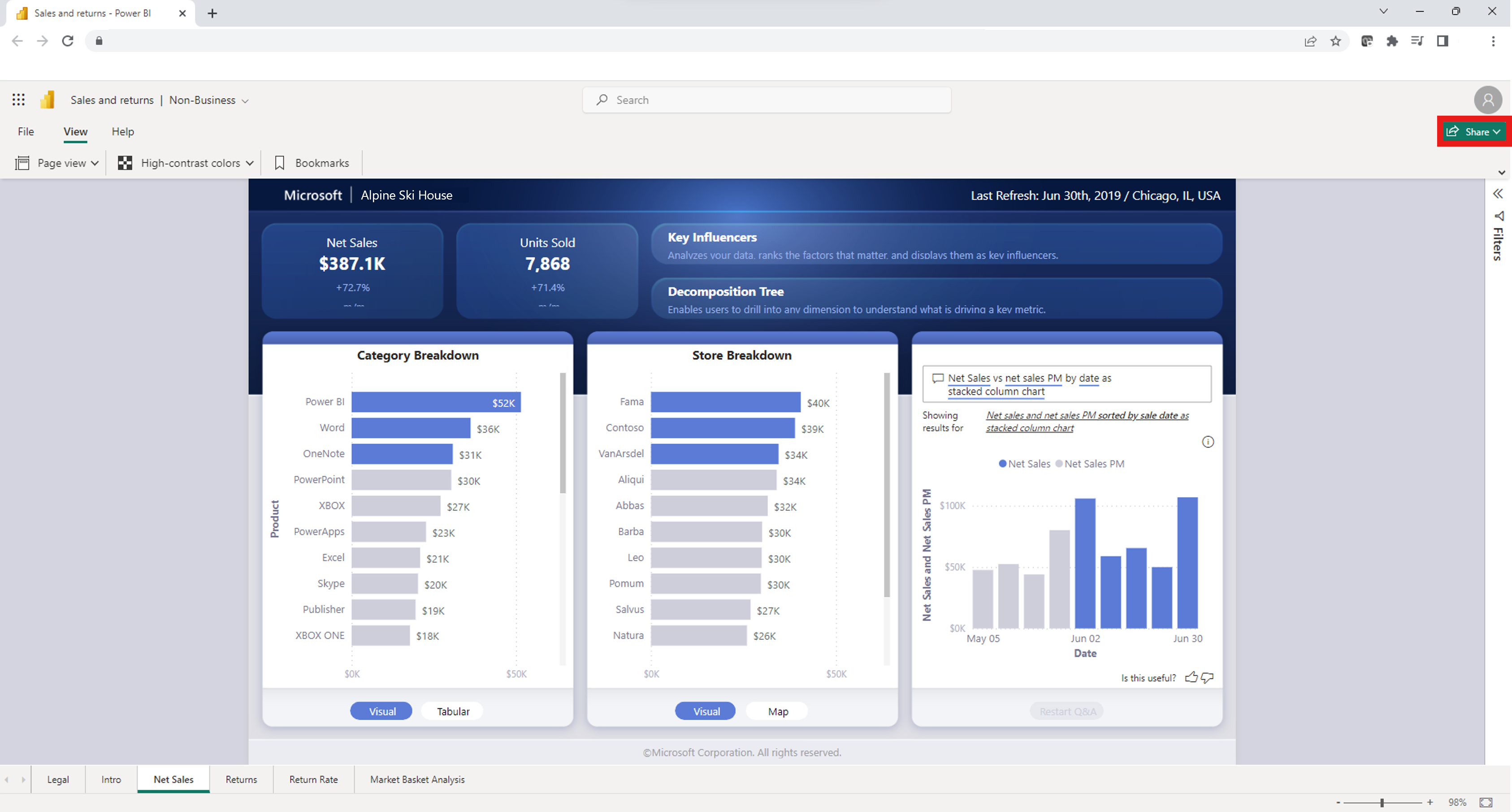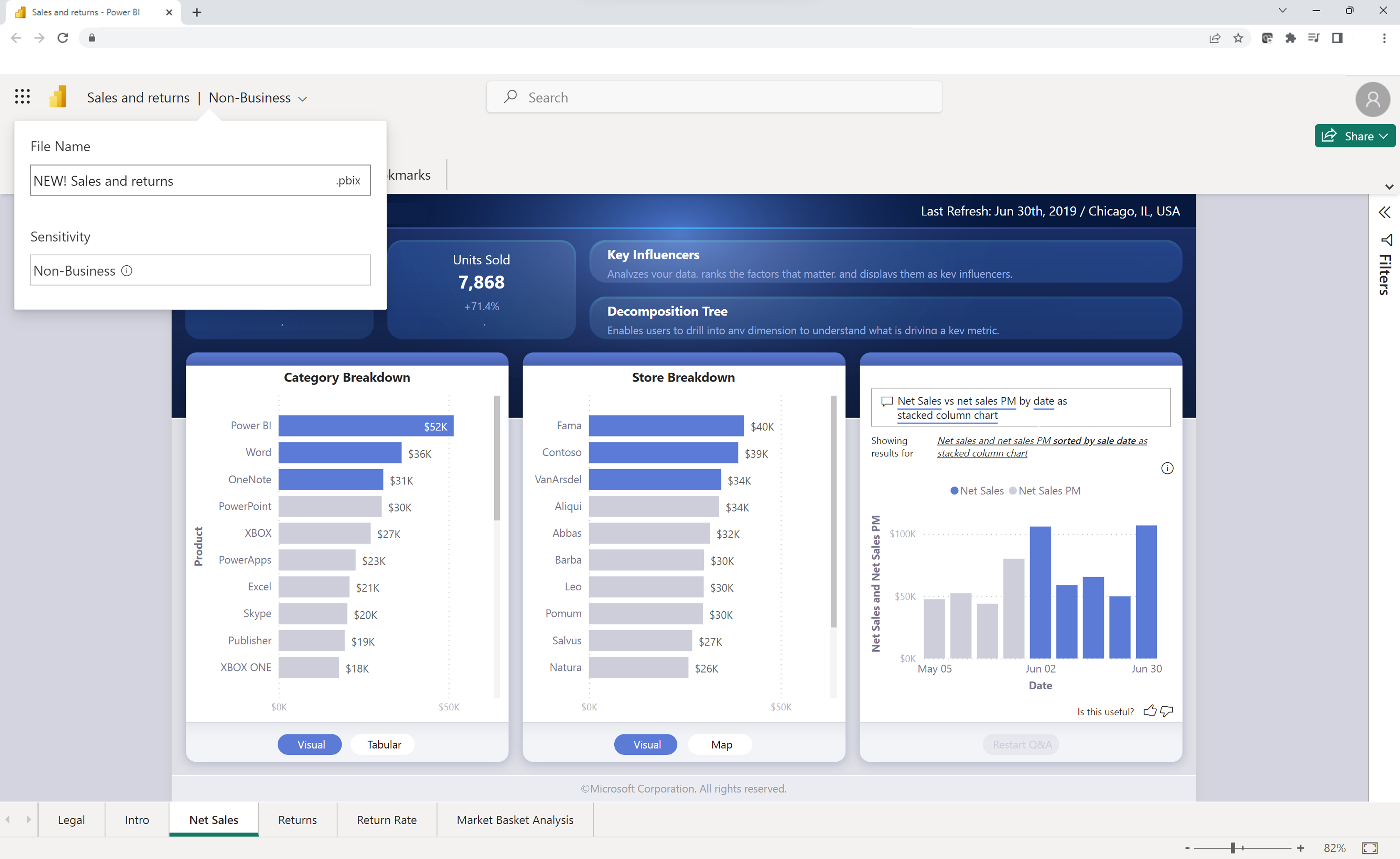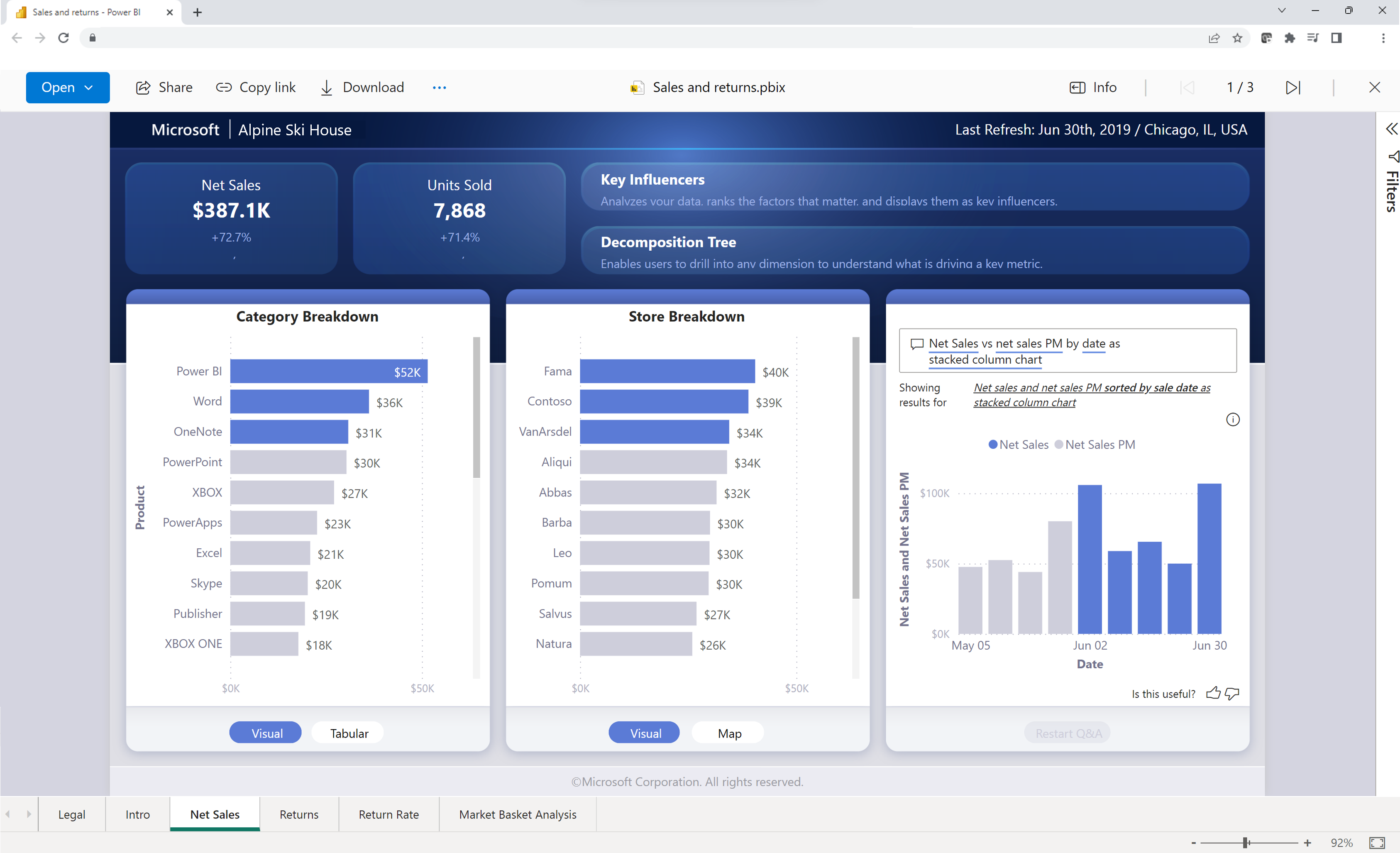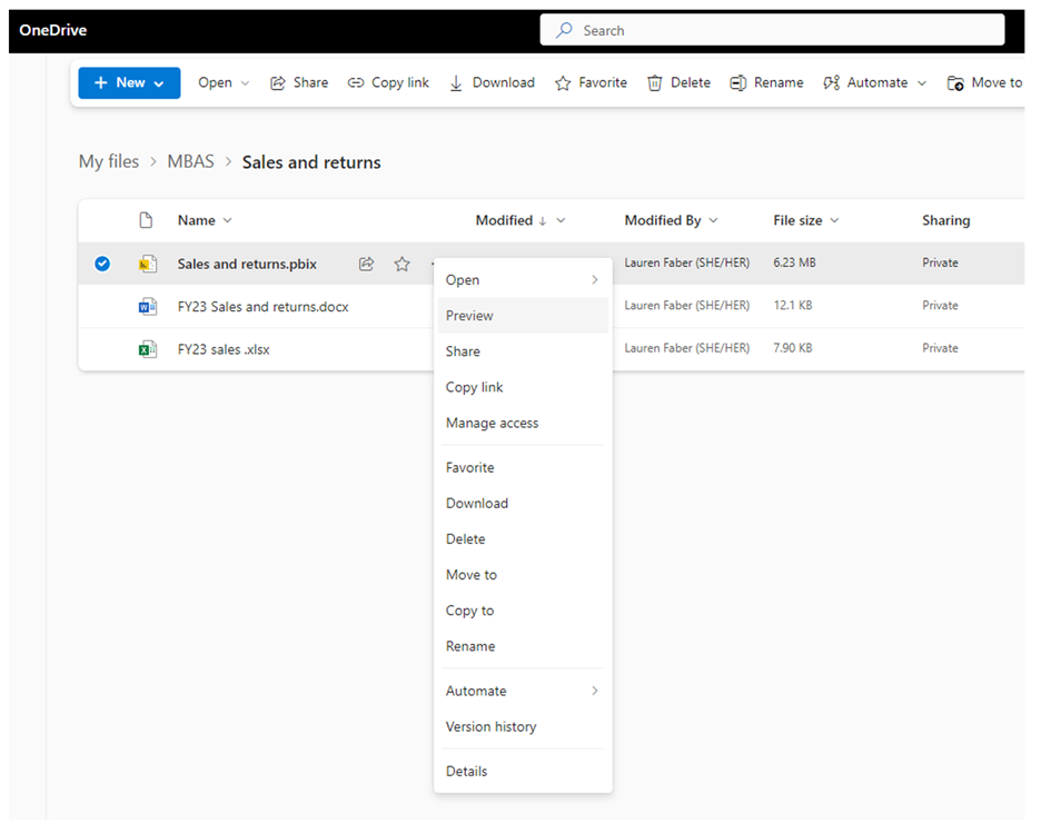 Du kan hurtigt få vist Power BI-filer i OneDrive og SharePoint uden at skulle installere Power BI Desktop eller downloade filen lokalt. Visning af Power BI-filer i din browser muliggør samarbejde og en strømlinet arbejdsproces, før du publicerer via Power BI-tjenesten.