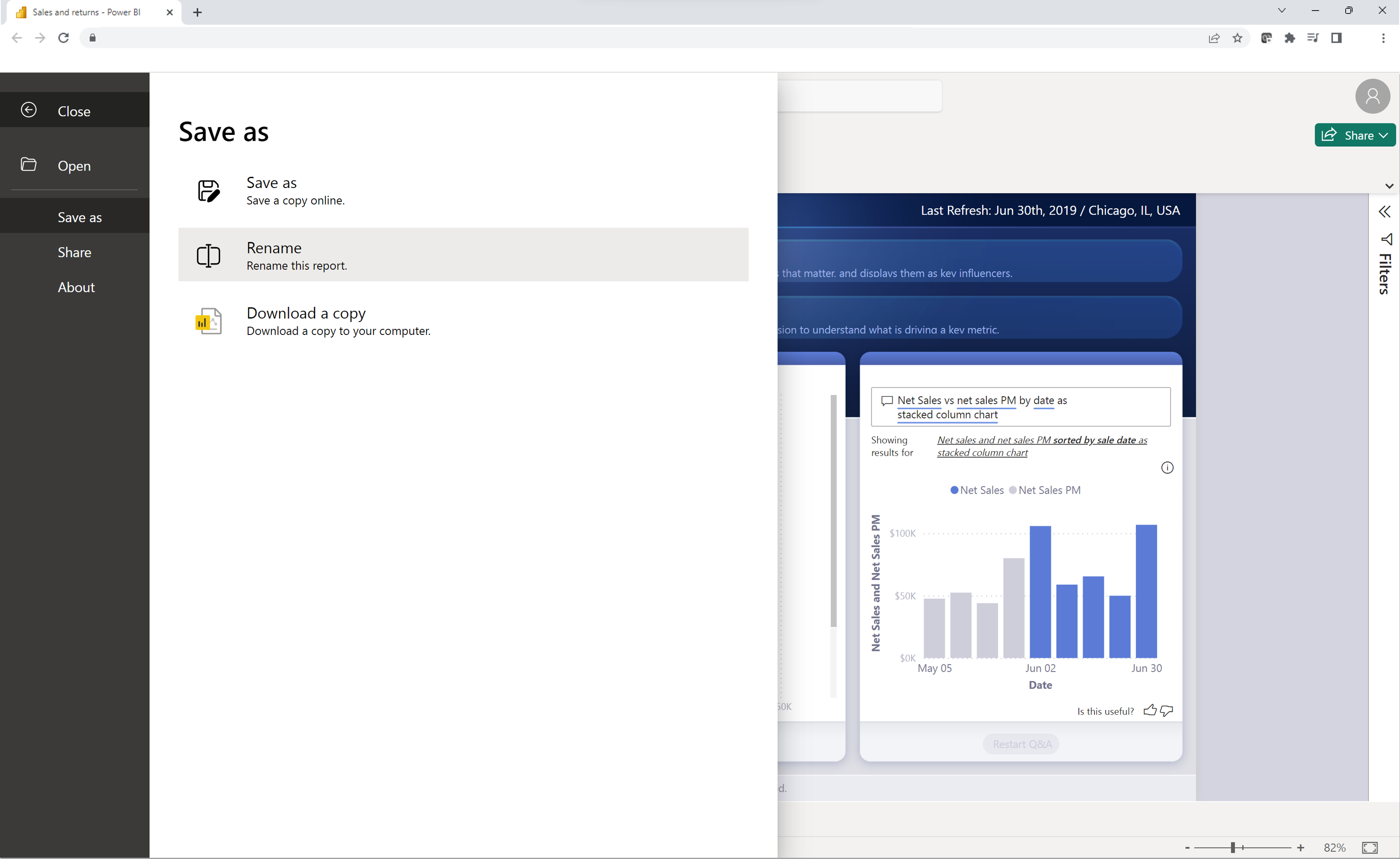 Hvis du vil downloade en kopi af rapporten til din enhed, skal du vælge Download en kopi i menuen Filer. En version af filen kopieres til Power BI-tjeneste, som derefter downloades til din enhed. Du kan åbne filen i Power BI Desktop for at redigere og publicere rapporten tilbage til Power BI-tjeneste.