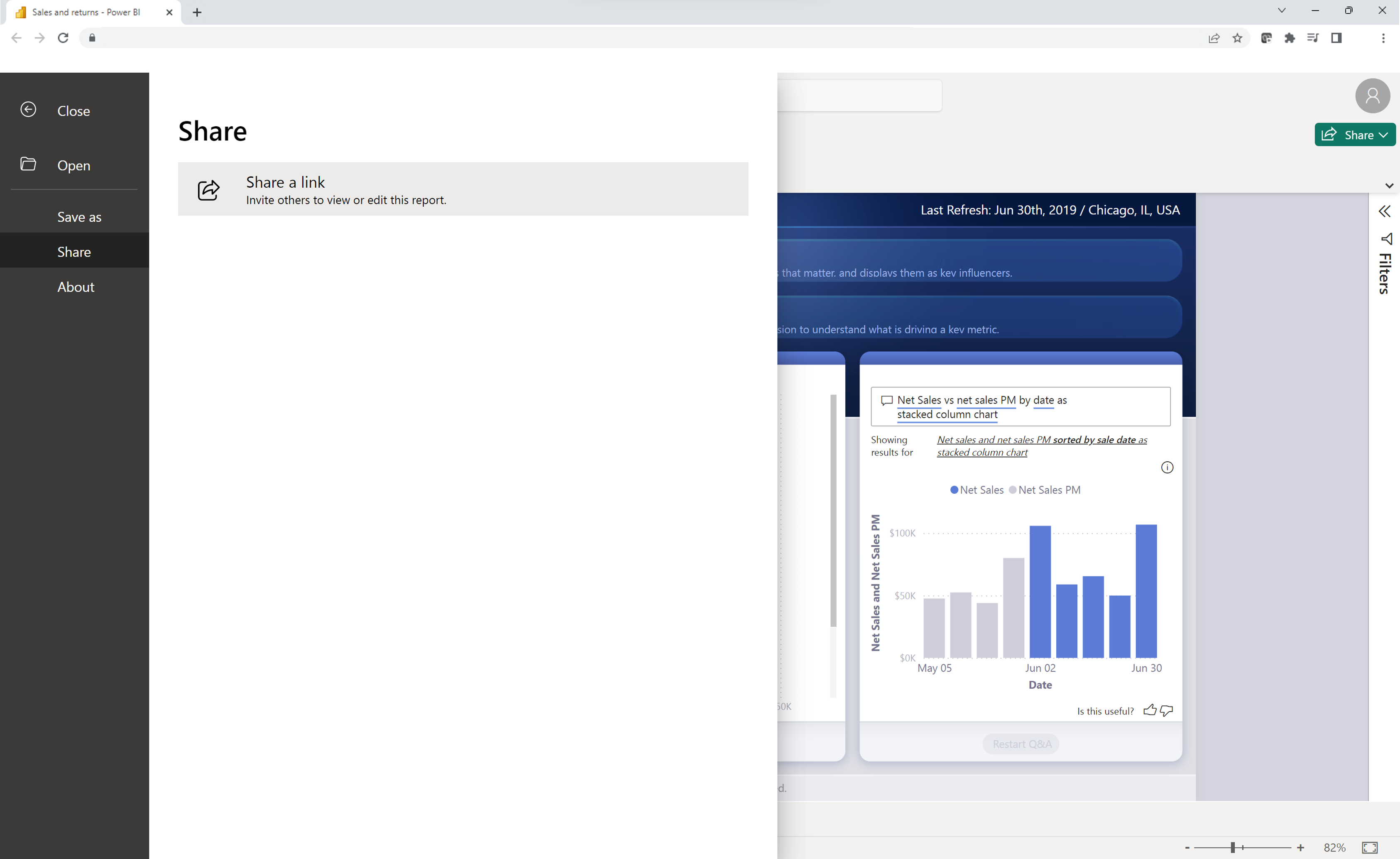 Du kan også dele et link til rapporten med andre ved at vælge knappen Del øverst til højre i rapporten.
