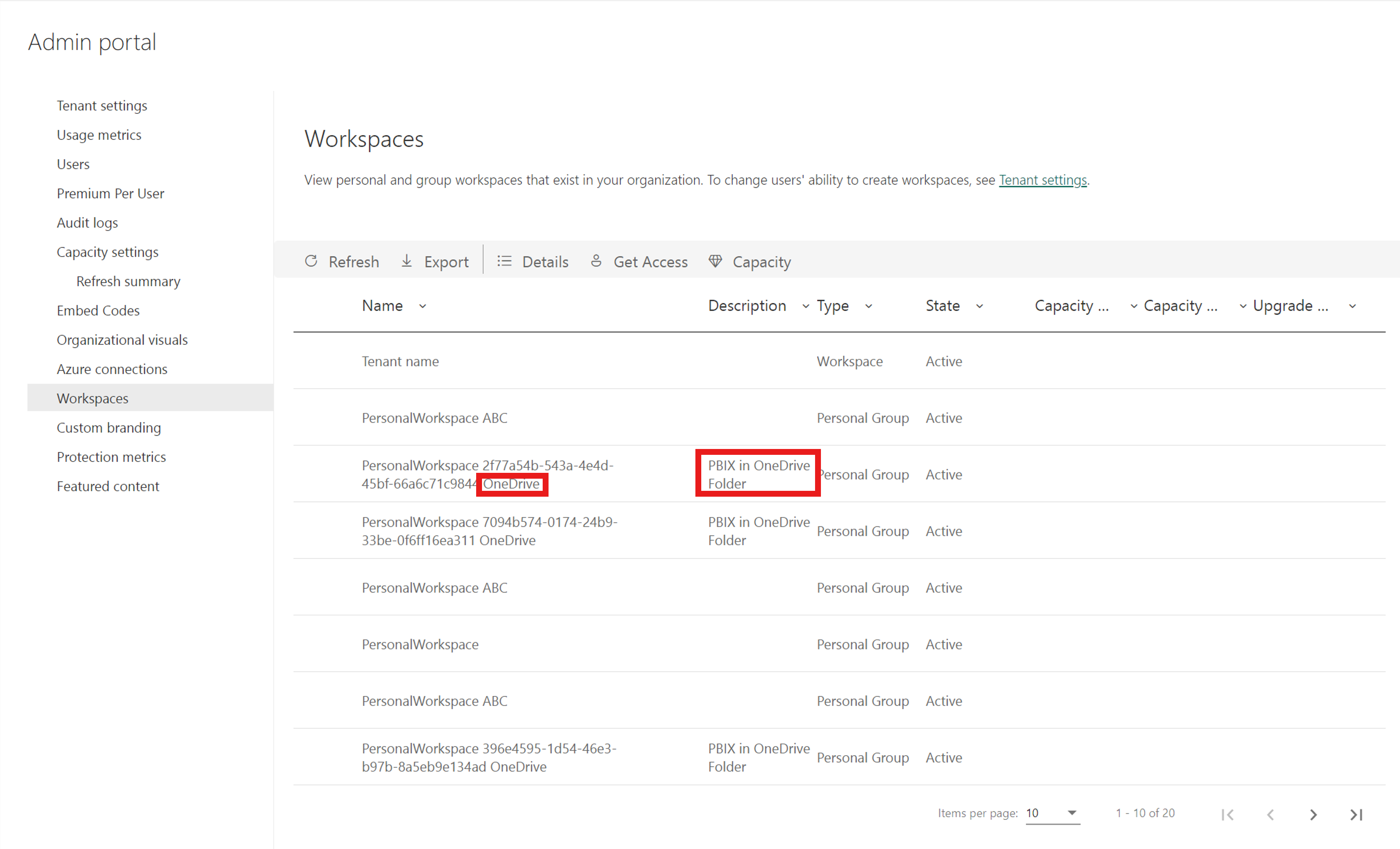 Administratorer kan se de arbejdsområder, der er oprettet i Power BI-tjeneste, under fanen Arbejdsområder på administrationsportalen. Oprettede arbejdsområder har ordet OneDrive i slutningen af navnet på arbejdsområdet. De er også angivet som PBIX i OneDrive-mappe i beskrivelseskolonnen.