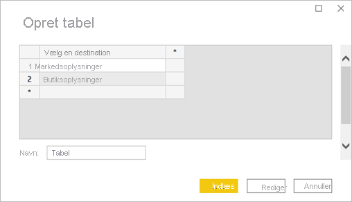 I dialogboksen Opret tabel skal du indtaste navnene på dine sider i kolonnen. Power BI bruger et nøjagtigt strengmatch til at angive destinationen for detaljeadgang. Sørg derfor for, at de værdier, du angiver, svarer nøjagtigt til navnene på dine detaljeadgangssider.