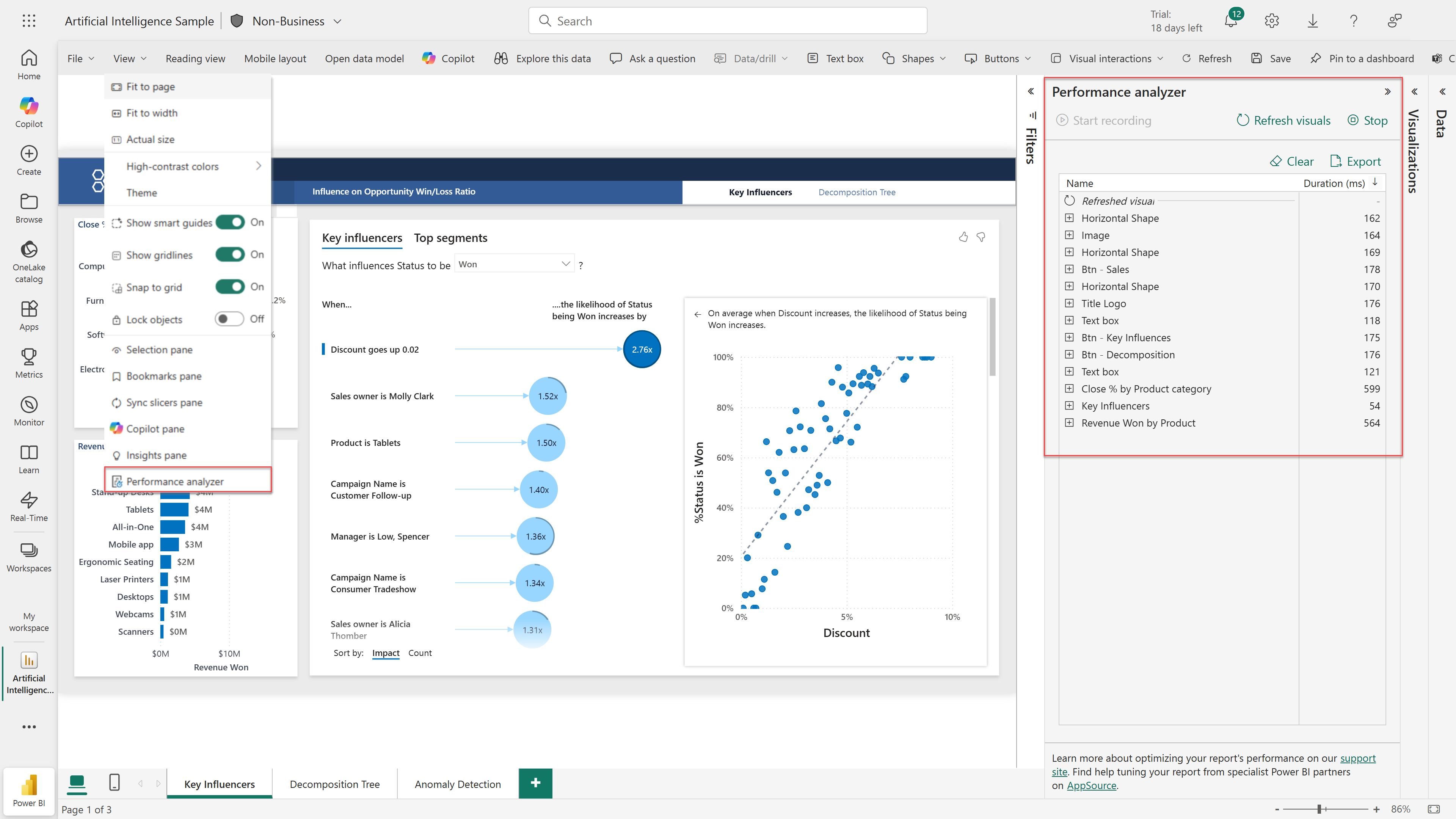 Åbn en rapport i Power BI-tjeneste , og vælg Rediger. Når du redigerer en rapport, skal du vælge menuen Vis og derefter vælge Effektivitetsanalyse for at få vist ruden Effektivitetsanalyse.