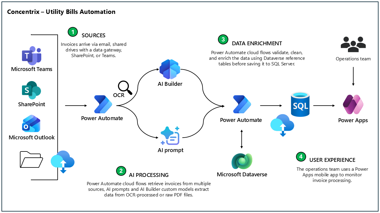 Concentrix erstattede sin manuelle fakturaproces med en fuldt automatiseret løsning, der er baseret på Power Automate, Power Apps, AI Builder og GPT-baseret udtrækning. I stedet for at downloade fakturaer, skrive data og håndtere undtagelser manuelt, læser den nye løsning fakturaer automatisk, udtrækker vigtige oplysninger og anvender forretningsregler med minimal menneskelig involvering.