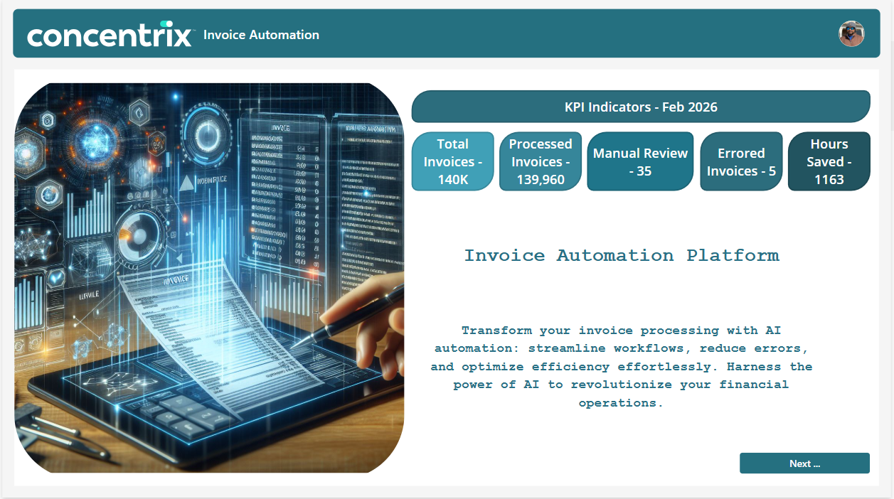 Skærmbillede af Dashboard til automatisering af Concentrix-faktura, der viser KPI'er (Key Performance Indicators), statistik for behandling af AI-fakturaer og knappen Næste.