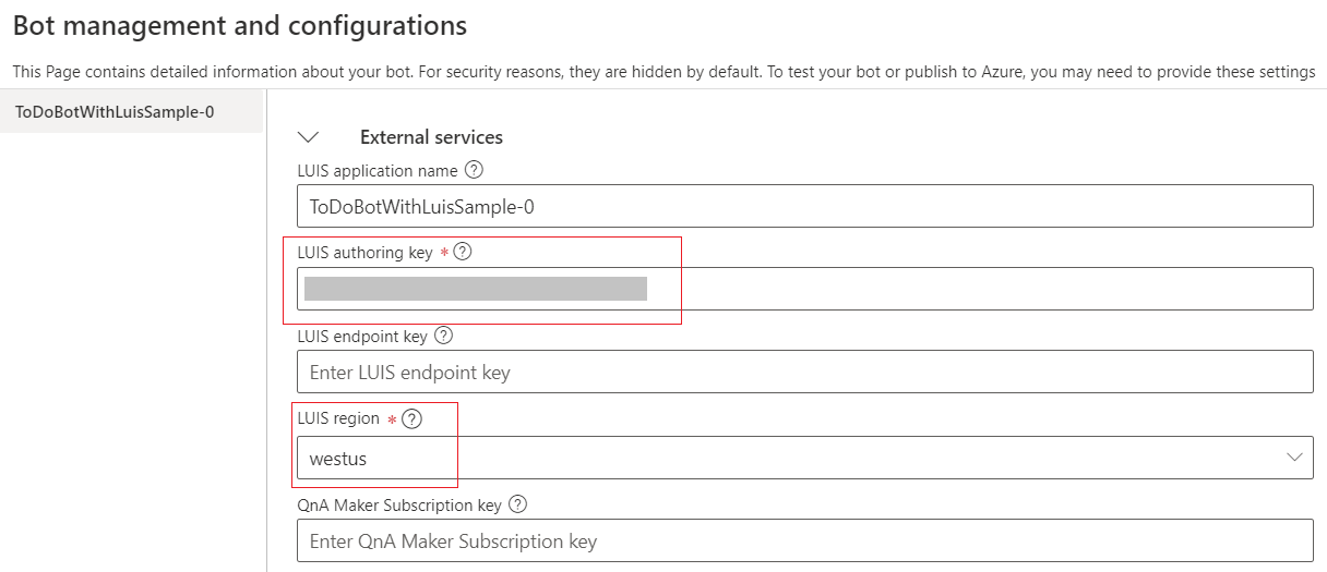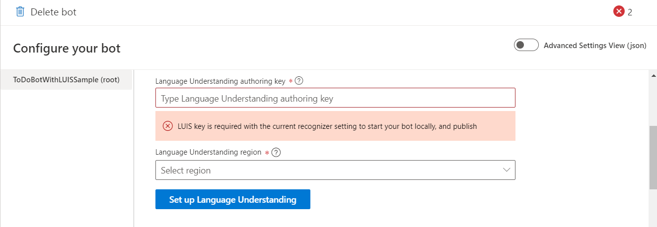 Selecting either error will bring up the Configure your bot screen where you can add your LUIS key and region, or Set up Language Understanding.