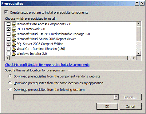 Both SQL Server 2005 Compact Edition and .NET Framework 2.0 should already be checked. If either of these two prerequisites is not already checked, check it now.