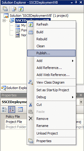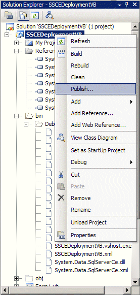 Figure 19. Selecting Publish on the SSCEDeploymentVB context menu