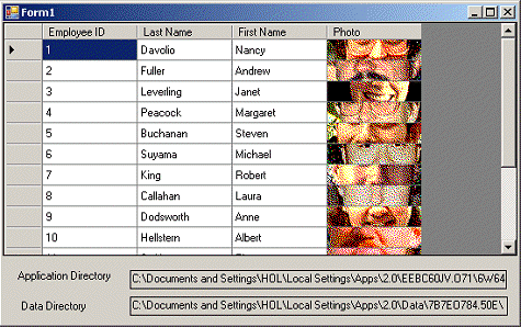 The Application Directory and Data Directory values at the bottom of the application form show the current locations of the application directory and data directory. You'll recall that when you ran the program directly from the executable file created by Visual Studio that the SQL Server Compact Edition database file was located in the same directory as the application. When you install the application by way of ClickOnce the application directory and data directory are now in different locations. This change in the location of the SQL Server Compact Edition database file relative to the application directory is why it is crucial to use the DataDirectory substitution string when specifying the path to the data source instead of using a fixed path.