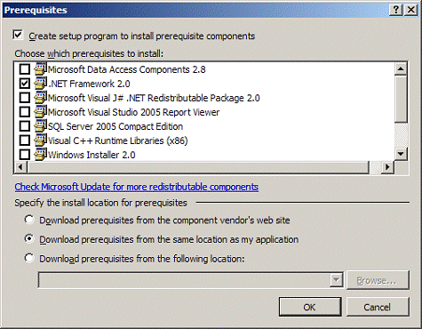 **Note **Choosing Download prerequisites from the same location as my application places the setup files for SQL Server Compact Edition on your Web site in addition to the setup files for your application. At the time that this tutorial is being written you must choose to download the SQL Server Compact Edition files from the same location as your application because SQL Server Compact Edition is not yet a released product; therefore, the SQL Server Compact Edition setup files referenced by ClickOnce are not yet available from the vendor's (Microsoft) Web site. If you are doing this tutorial after the public release of SQL Server Compact Edition, you might want to try selecting Download prerequisites from the component vendor's Web site. Configuring the ClickOnce package to download SQL Server Compact Edition from the vendor's Web site reduces the download burden on your Web site and insures that the user gets the most up-to-date version of SQL Server Compact Edition.