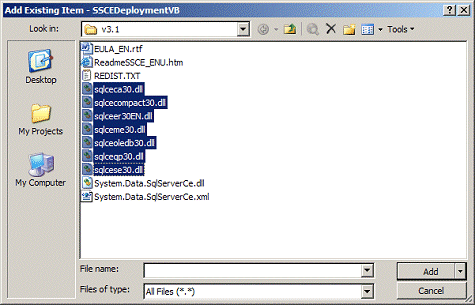 Still in the Add Existing Item dialog box, navigate to the location where the SQL Server Compact Edition DLL files are installed which by default is C:\Program Files\Microsoft SQL Server Compact Edition\v3.1.
