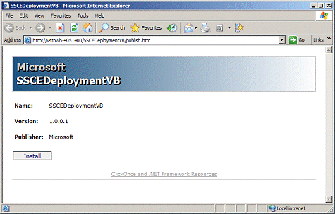 After the wizard builds and publishes the application, , the wizard opens Internet Explorer displaying the application installation Web page, as shown in Figure 21. It might take a few moments before the Web page is displayed.