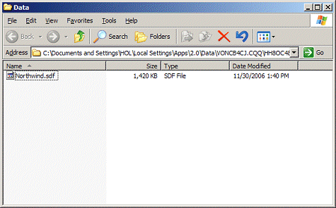 A Windows Explorer Window opens and displays the contents of the data directory, as shown in Figure 24. In this window, you can see that the Northwind.sdf data file is installed into the directory.
