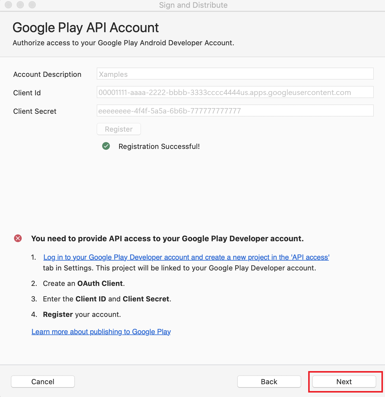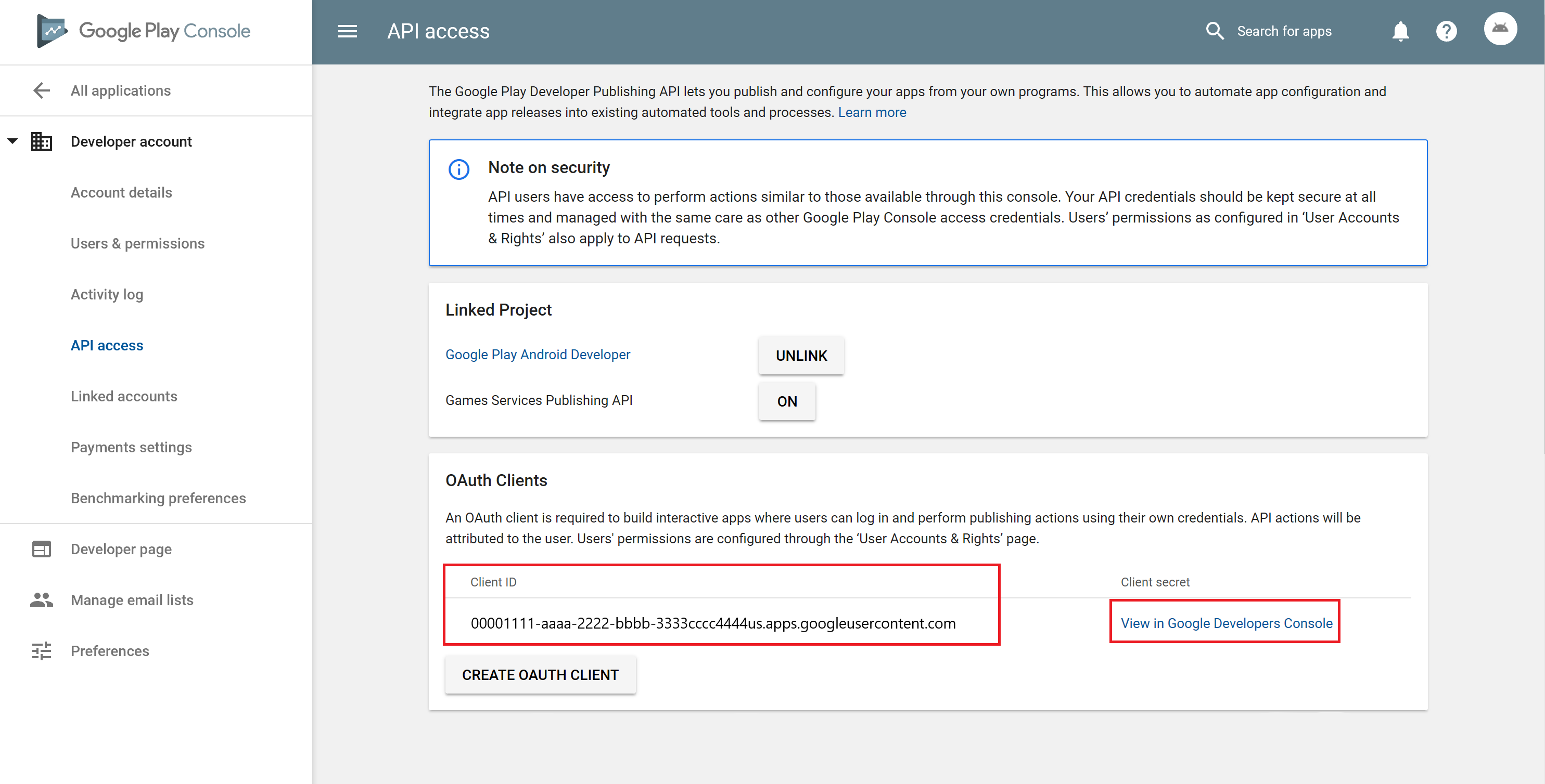 In the Register Google API Access dialog, you must provide the Client ID and Client secret that provides API access to your Google Play Developer account: