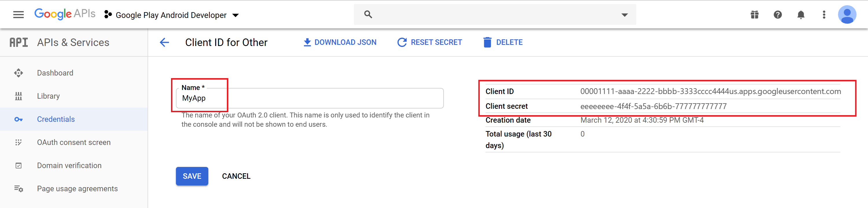 The default name of the OAuth client is Google Play Android Developer. This can be changed to the name of Xamarin.Android app, or any suitable name. In this example, the OAuth Client name is changed to the name of the app, MyApp: