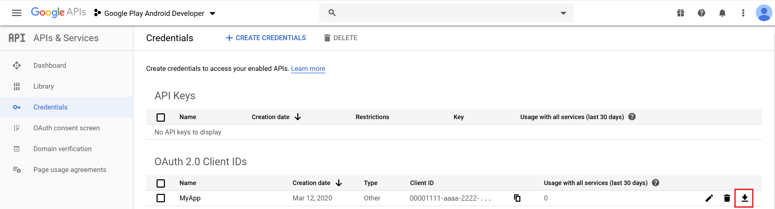 Click Save to save changes. This returns to the Credentials page where to download the credentials by clicking on the Download JSON icon:
