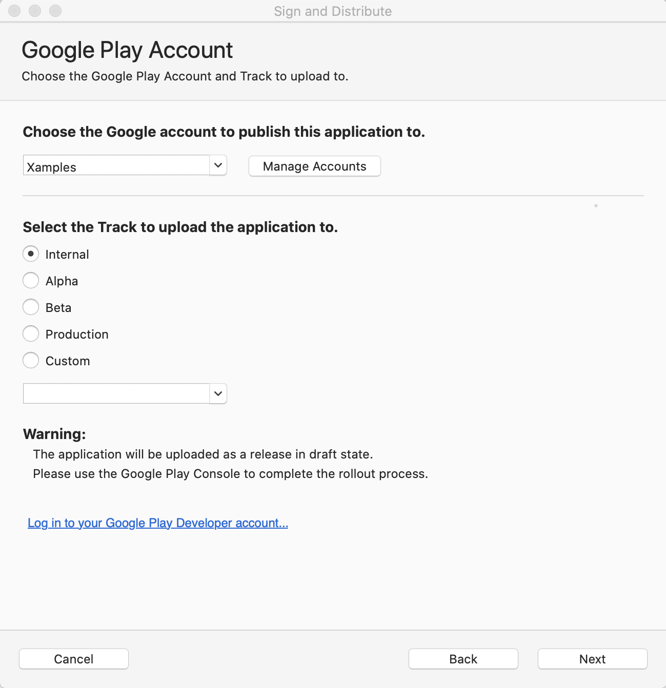 Next, the Google Play Track dialog is presented. Google Play offers five possible tracks for uploading your app: