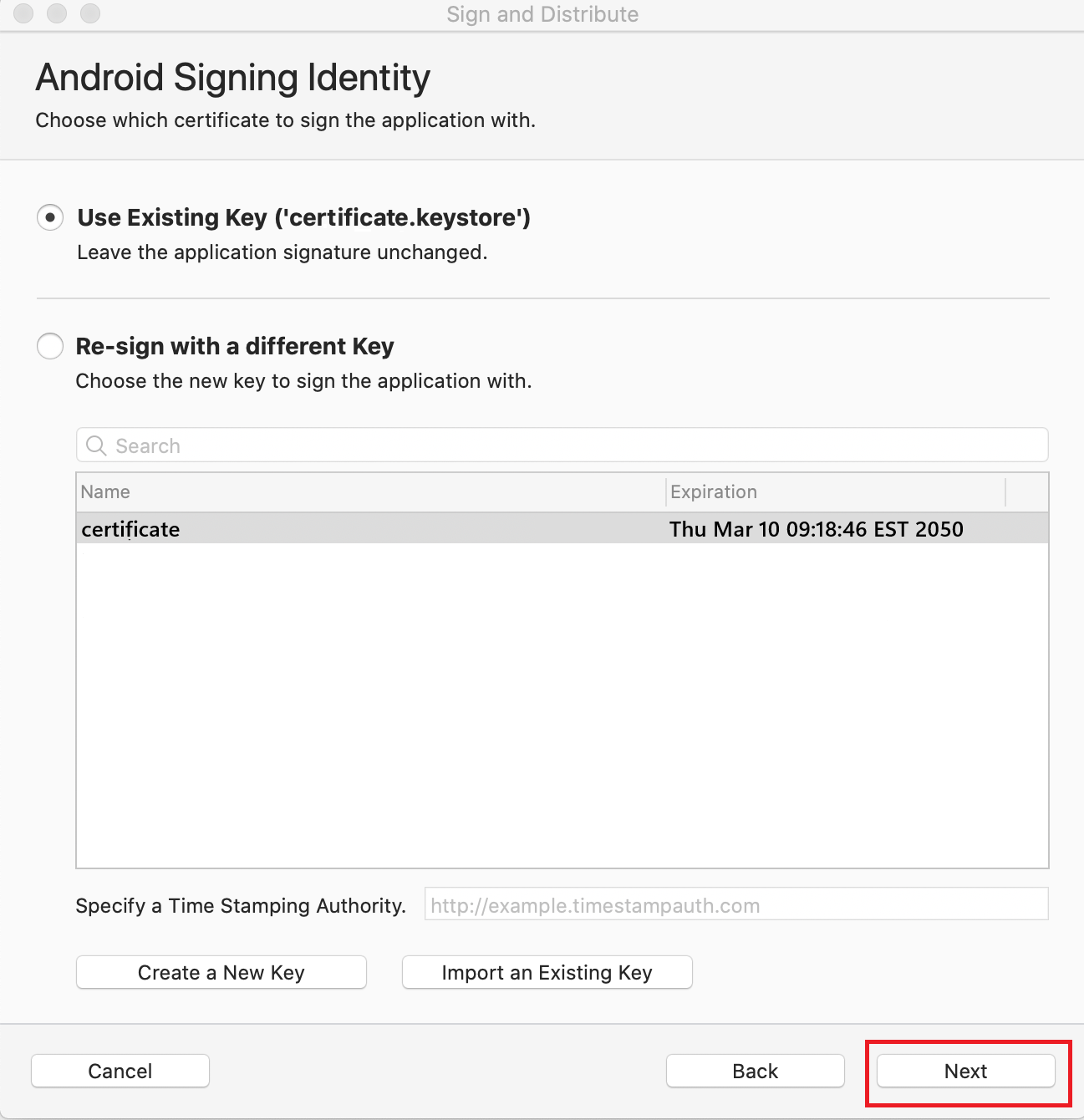 In the Signing Identity dialog, select the identity created in Creating a New Certificate and click Continue:
