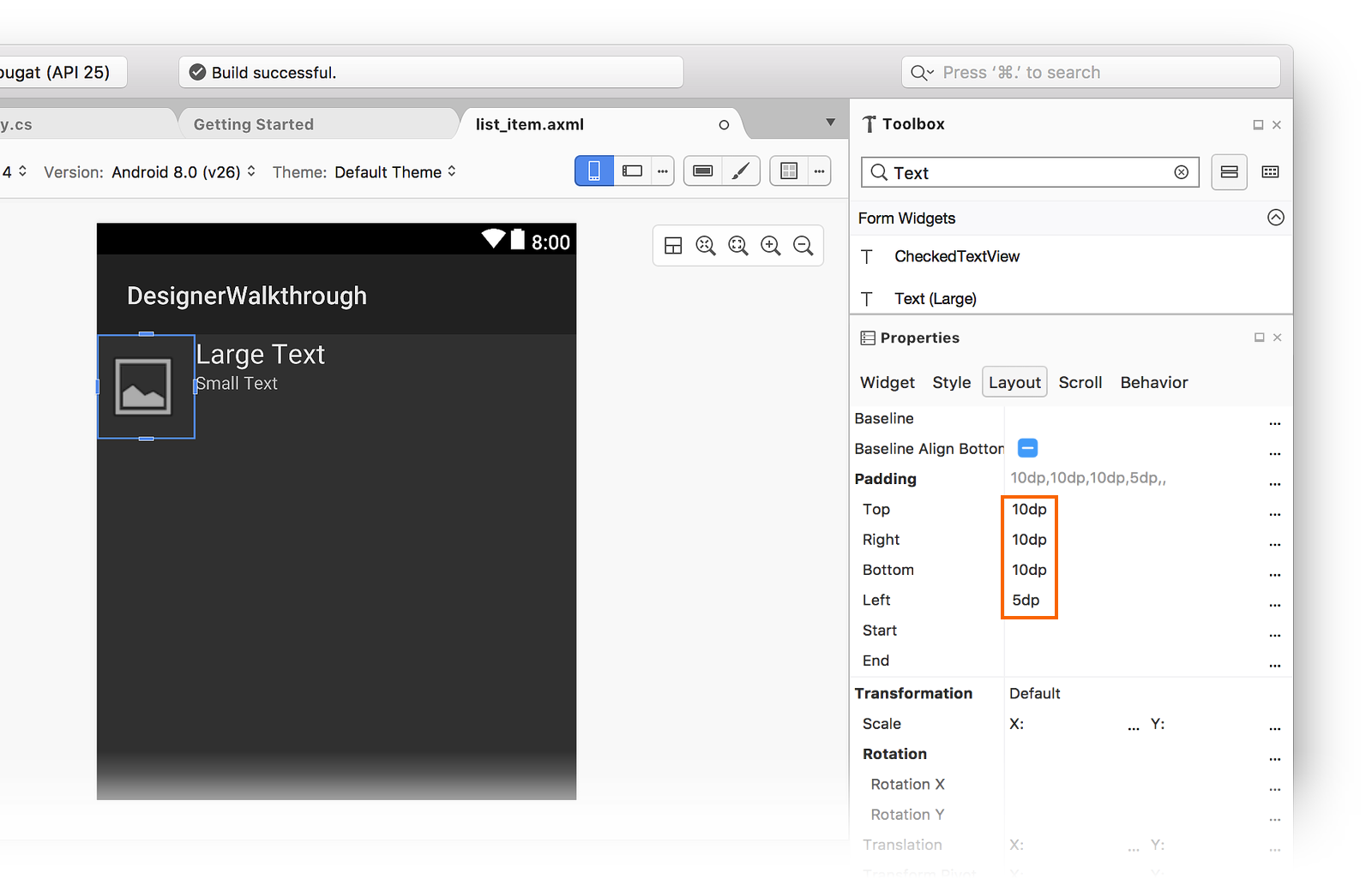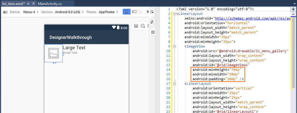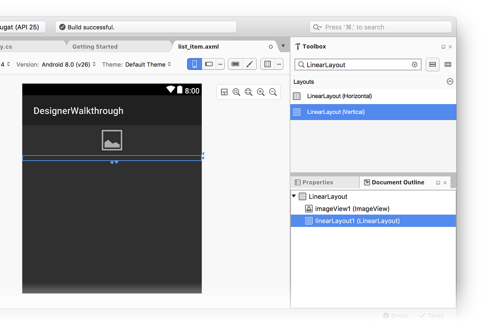 This article walked through the process of using the Xamarin.Android Designer in Visual Studio to create a user interface for a basic app. It demonstrated how to create the interface for a single item in a list, and it illustrated how to add widgets and lay them out visually. It also explained how to assign resources and then set various properties on those widgets.