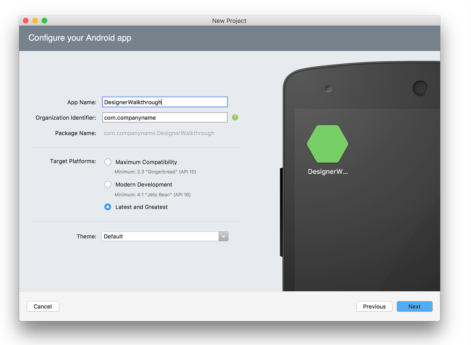 The first step is to create a new Xamarin.Android project. Launch Visual Studio, click New Project..., and choose the Visual C# > Android > Android App (Xamarin) template. Name the new app DesignerWalkthrough and click OK.