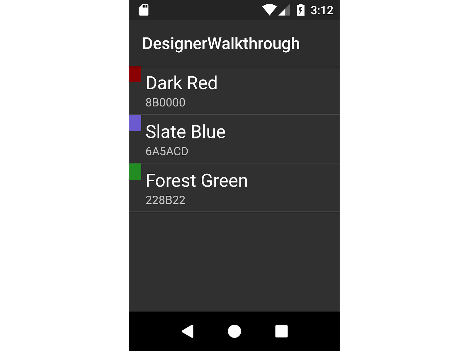The objective of this walkthrough is to use the Android Designer to create a user interface for an example color browser app. The color browser app presents a list of colors, their names, and their RGB values. You'll learn how to add widgets to the Design Surface as well as how to lay out these widgets visually. After that, you'll learn how to modify widgets interactively on the Design Surface or by using the Designer's Properties pane. Finally, you'll see how the design looks when the app runs on a device or emulator.