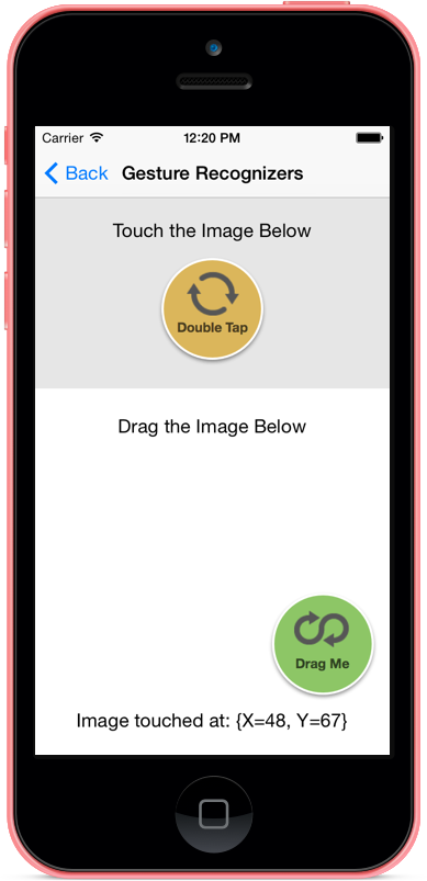 UITapGestureRecognizerthat will change the image being displayed in DoubleTouchImage. Add the following method to theGestureViewControllercontroller:private void WireUpTapGestureRecognizer() { // Create a new tap gesture UITapGestureRecognizer tapGesture = null; // Report touch Action action = () => { TouchStatus.Text = string.Format("Image touched at: {0}",tapGesture.LocationOfTouch(0, DoubleTouchImage)); // Toggle the image if (imageHighlighted) { DoubleTouchImage.Image = UIImage.FromBundle("DoubleTapMe.png"); } else { DoubleTouchImage.Image = UIImage.FromBundle("DoubleTapMe_Highlighted.png"); } imageHighlighted = !imageHighlighted; }; tapGesture = new UITapGestureRecognizer(action); // Configure it tapGesture.NumberOfTapsRequired = 2; // Add the gesture recognizer to the view DoubleTouchImage.AddGestureRecognizer(tapGesture); }This code is very similar to the code for the