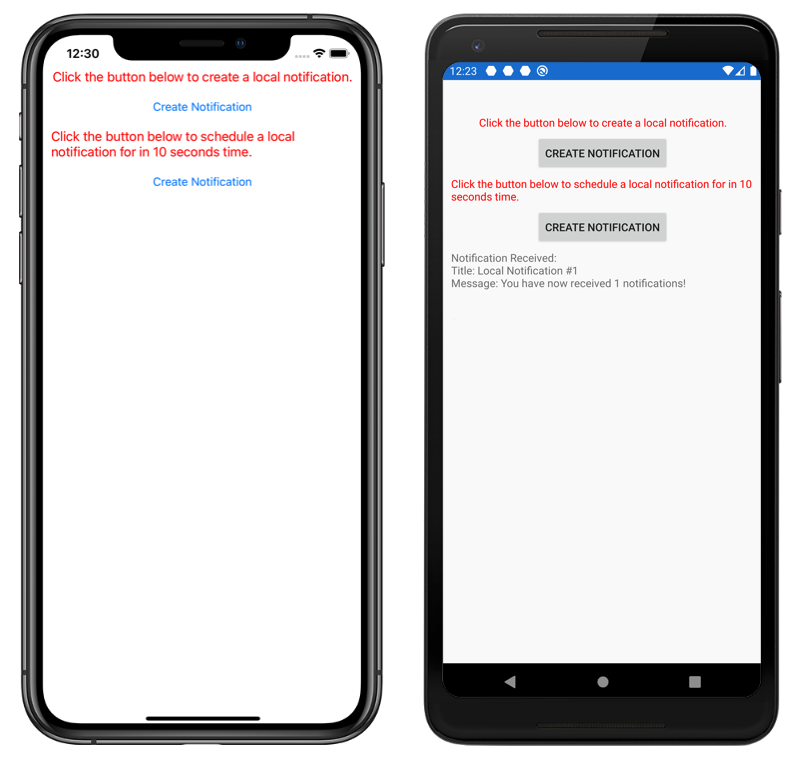 Once the platform projects contain a registered implementation of the INotificationManager interface, the application can be tested on both platforms. Run the application and click either of the Create Notification buttons to create a notification.