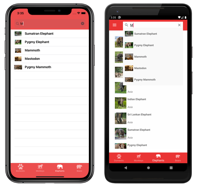 Xamarin.Forms Shell includes integrated search functionality that's provided by the SearchHandler class. Search capability can be added to a page by adding a subclassed SearchHandler object to it. This results in a search box being added at the top of the page. When data is entered into the search box, the search suggestions area is populated with data: