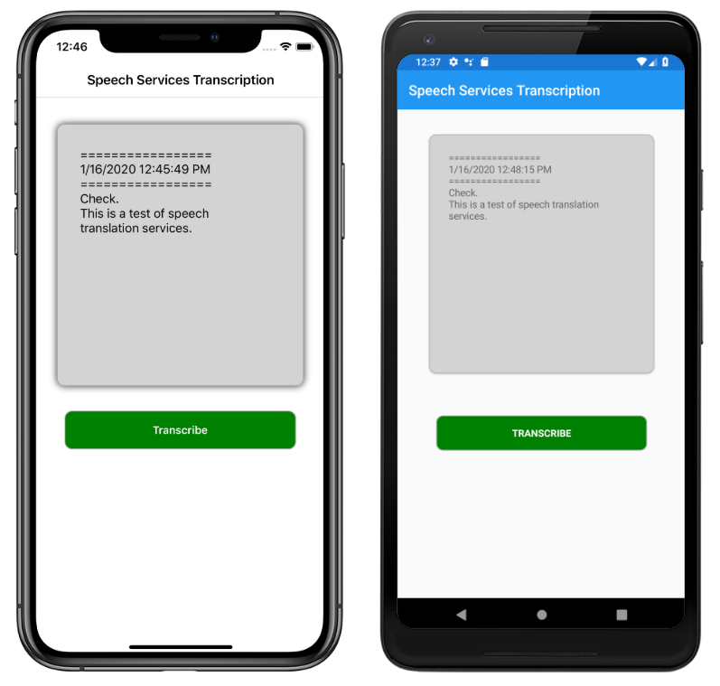 This article explains how speech-to-text is implemented in the sample Xamarin.Forms application using the Azure Speech Service. The following screenshots show the sample application on iOS and Android: