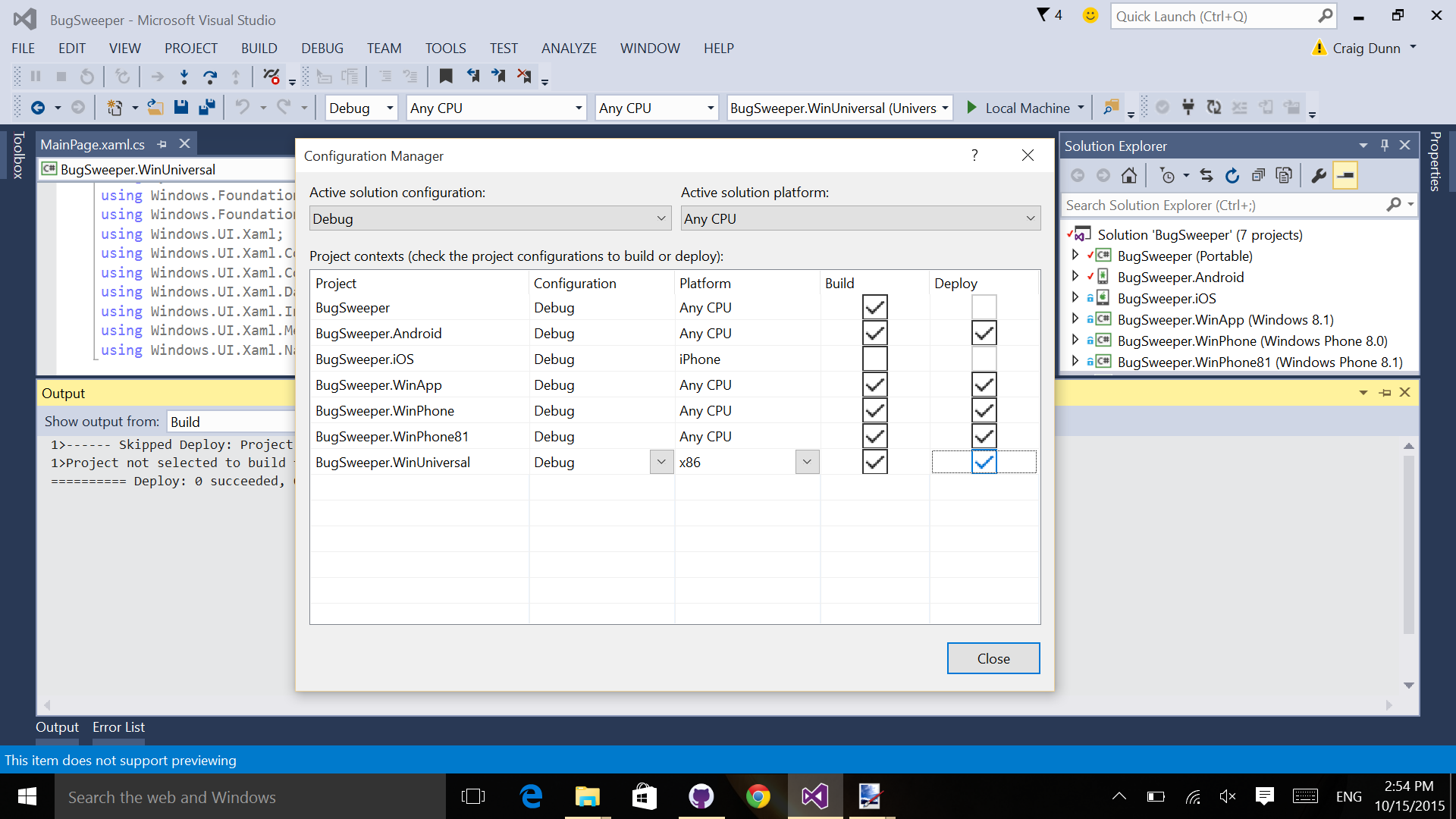 4 . Make sure the new UWP project will be built in the Build > Configuration Manager window (this probably won't have happened by default). Tick the Build and Deploy boxes for the Universal project: