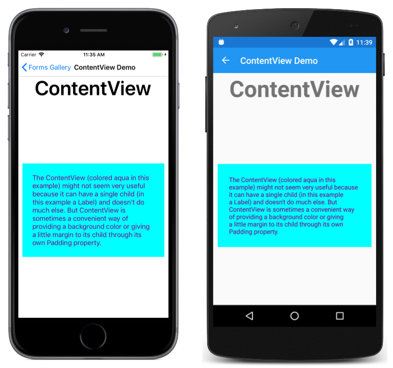 ContentView contains a single child that is set with the Content property. The Content property can be set to any View derivative, including other Layout derivatives. ContentView is mostly used as a structural element and serves as a base class to Frame.API Documentation / Guide |