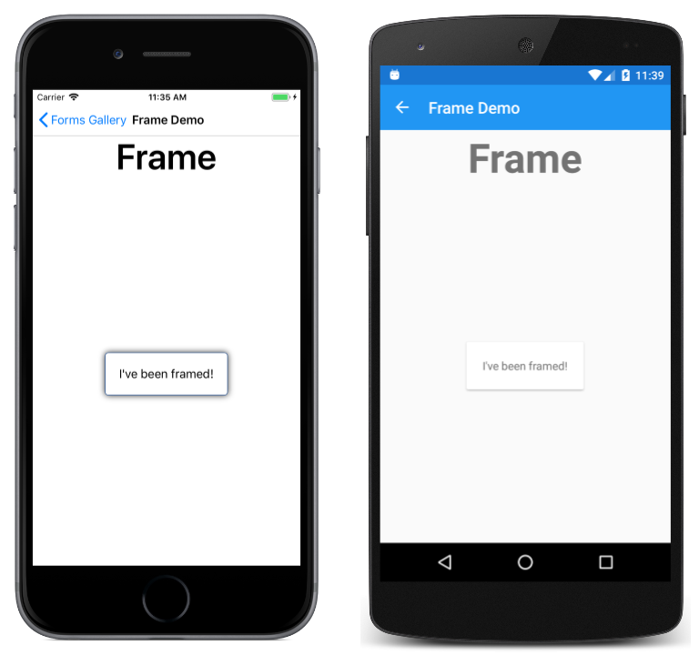 The Frame class derives from ContentView and displays a border, or frame, around its child. The Frame class has a default Padding value of 20, and also defines BorderColor, CornerRadius, and HasShadow properties.API Documentation / Guide |