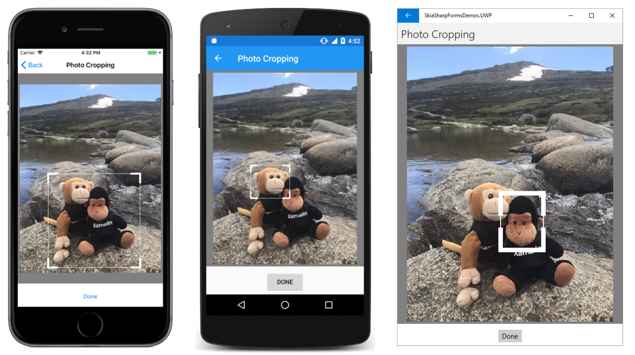 The code-behind file instantiates the PhotoCropperCanvasView with the bitmap passed to its constructor. Notice that a 1 is passed as the second argument to PhotoCropperCanvasView. This aspect ratio of 1 forces the cropping rectangle to be a square: