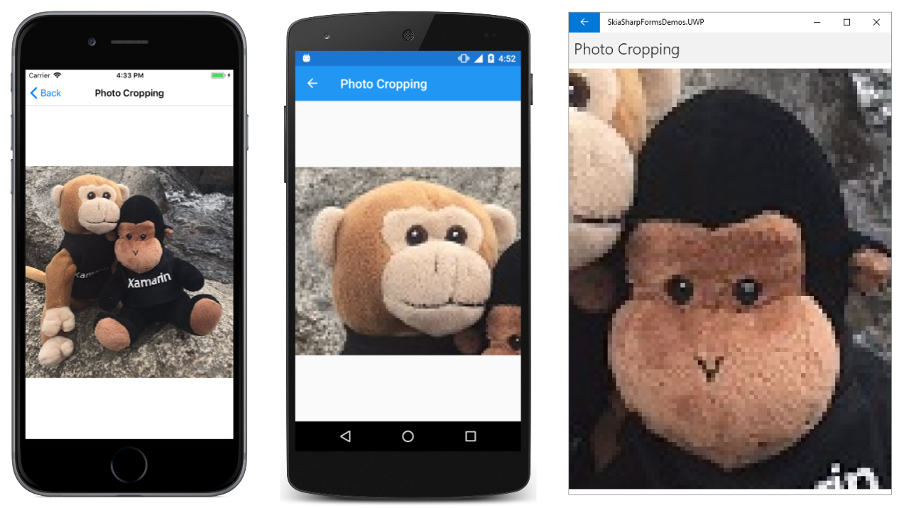 When a good cropping rectangle has been defined, click the Done button. The Clicked handler obtains the cropped bitmap from the CroppedBitmap property of PhotoCropperCanvasView, and replaces all the content of the page with a new SKCanvasView object that displays this cropped bitmap: