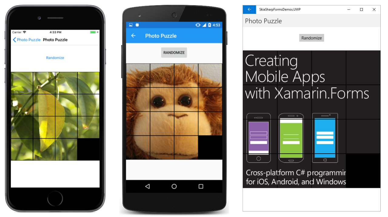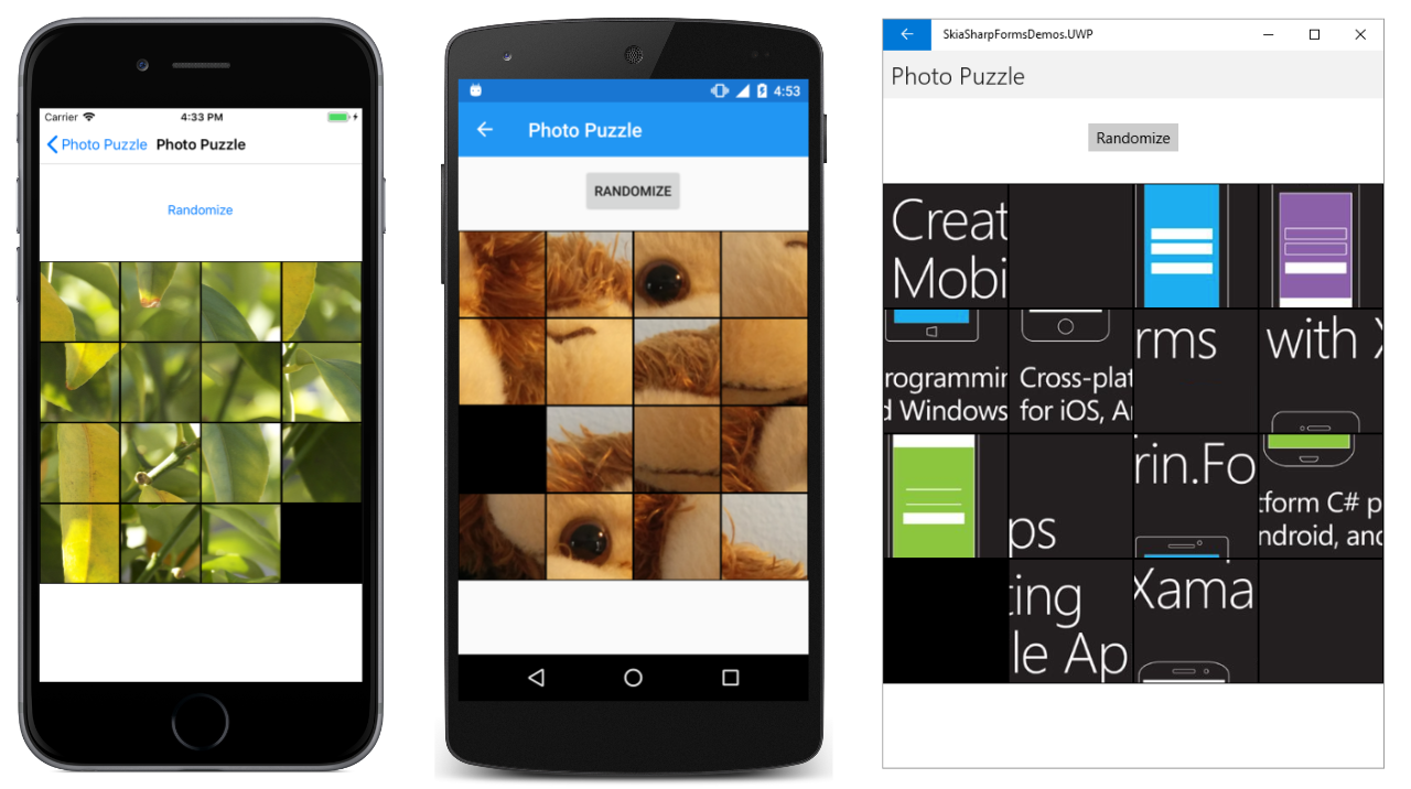 A Xamarin.Forms version of the famous 14-15 puzzle appeared in Chapter 22 of the book Creating Mobile Apps with Xamarin.Forms and can be downloaded as XamagonXuzzle. However, the puzzle becomes more fun (and often more challenging) when it is based on an image from your own photo library.