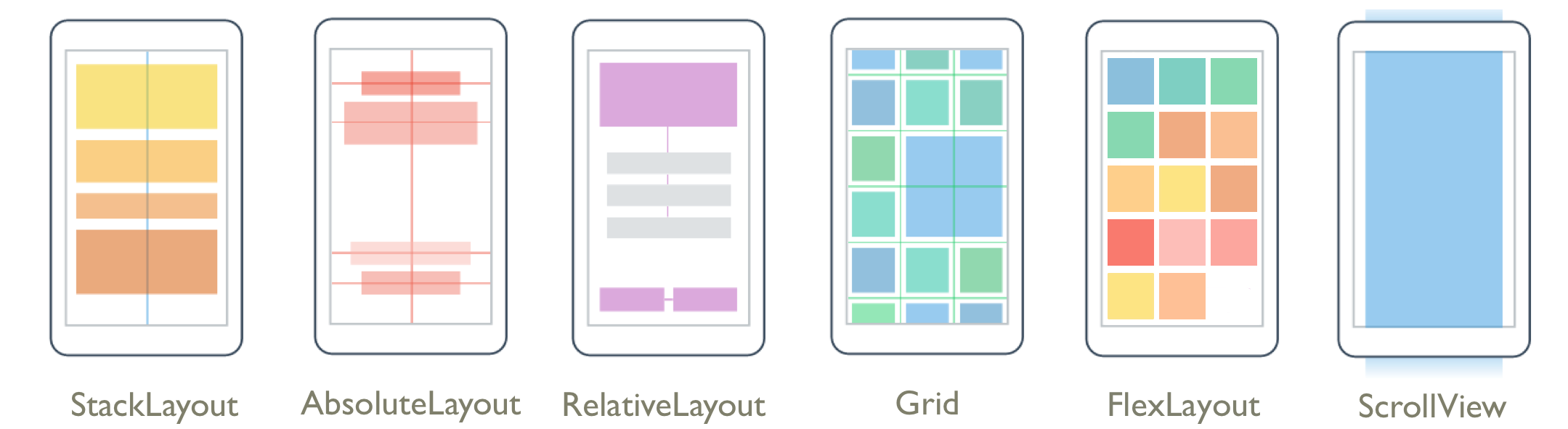 The following image shows typical layouts that can be achieved with the main Xamarin.Forms layout classes: