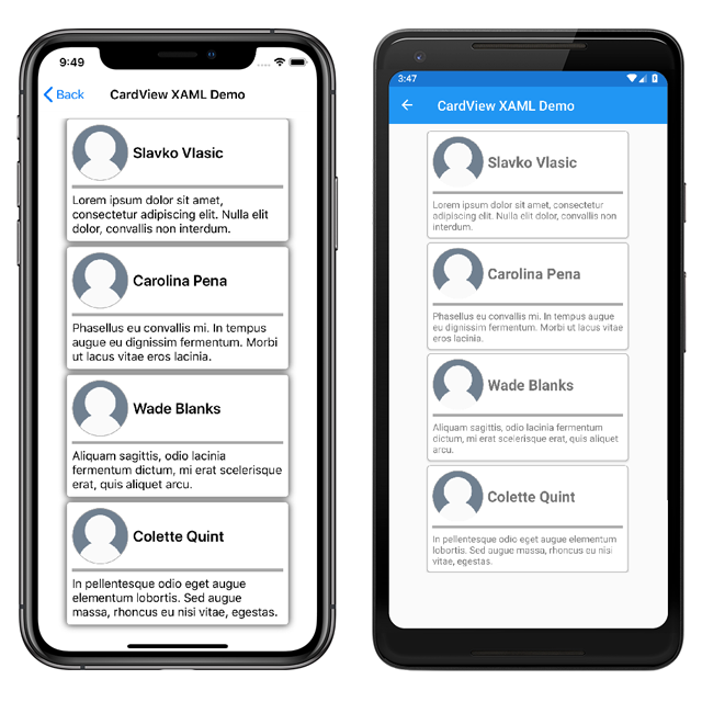 The following screenshots show a standard CardView instance and CardView whose ControlTemplate has been overridden: