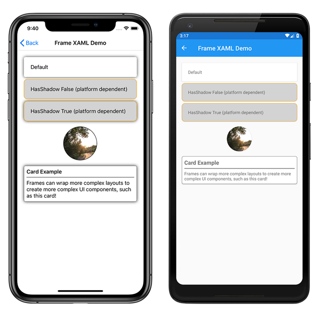Combining a Frame object with a Layout object such as a StackLayout object allows the creation of more complex UI. The following screenshot shows an example card, created using a Frame object: