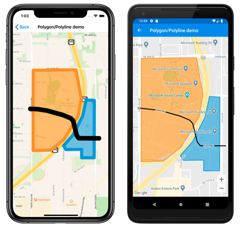 The StrokeColor and StrokeWidth properties are specified to customize the polygon's outline. The FillColor property value matches the StrokeColor property value but has an alpha value specified to make it transparent, allowing the underlying map to be visible through the shape. The GeoPath property contains a list of Position objects defining the geographic coordinates of the polygon points. A Polygon object is rendered on the map once it has been added to the MapElements collection of the Map.
