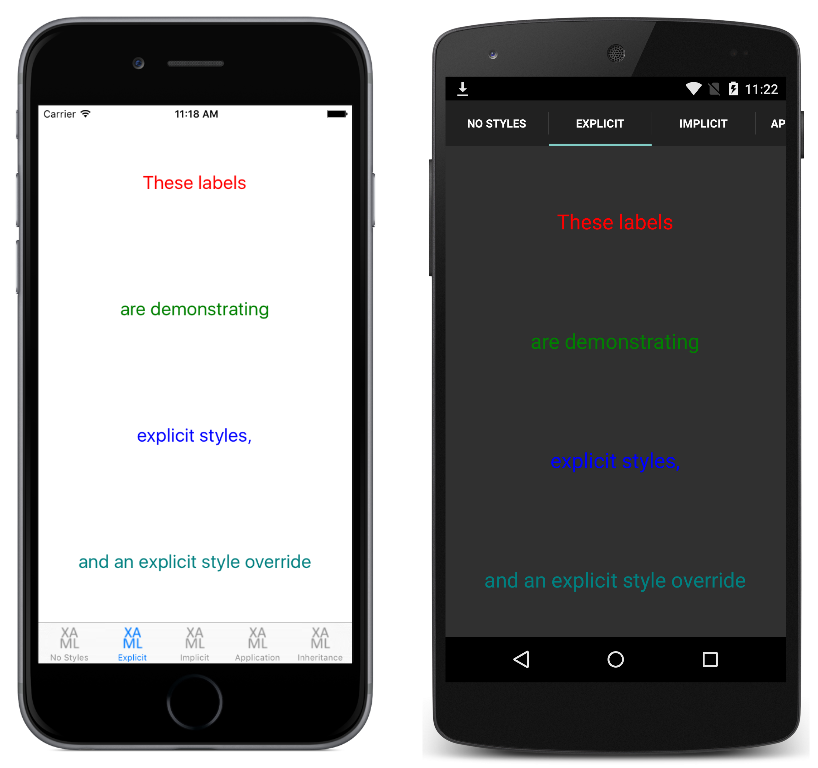 The following code example shows explicit styles declared in XAML in a page's ResourceDictionary and applied to the page's Label instances: