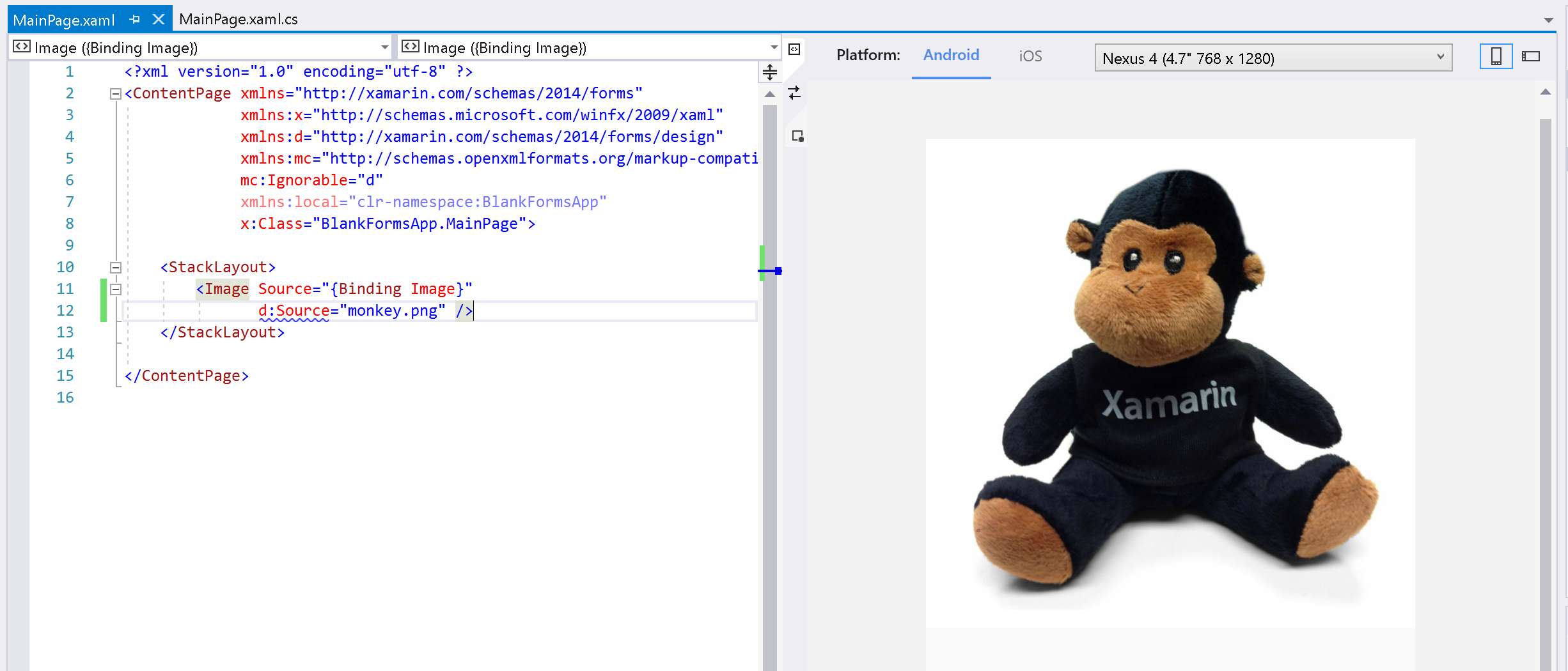 You can set a design time Source for images that are bound to the page or loaded in dynamically. In your Android project, add the image you want to show in the XAML Previewer to the Resources > Drawable folder. In your iOS project, add the image to the Resources folder. You can then show that image in the XAML Previewer at design time: