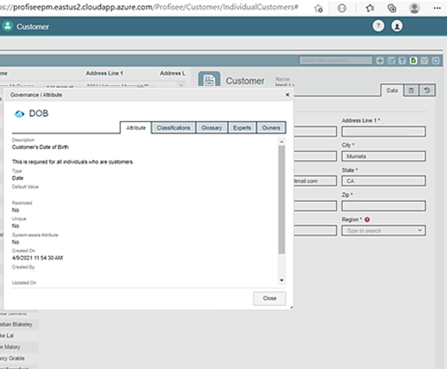 The Profisee MDM Governance dialog is the interface through which data stewards and users interact with governance-level details. This UI renders information that's obtained from Microsoft Purview to users. By using this information, users can review the details behind the data from which the dialog was launched. If the information that's provided in the Governance dialog is insufficient, users can go directly to the Microsoft Purview user experience.