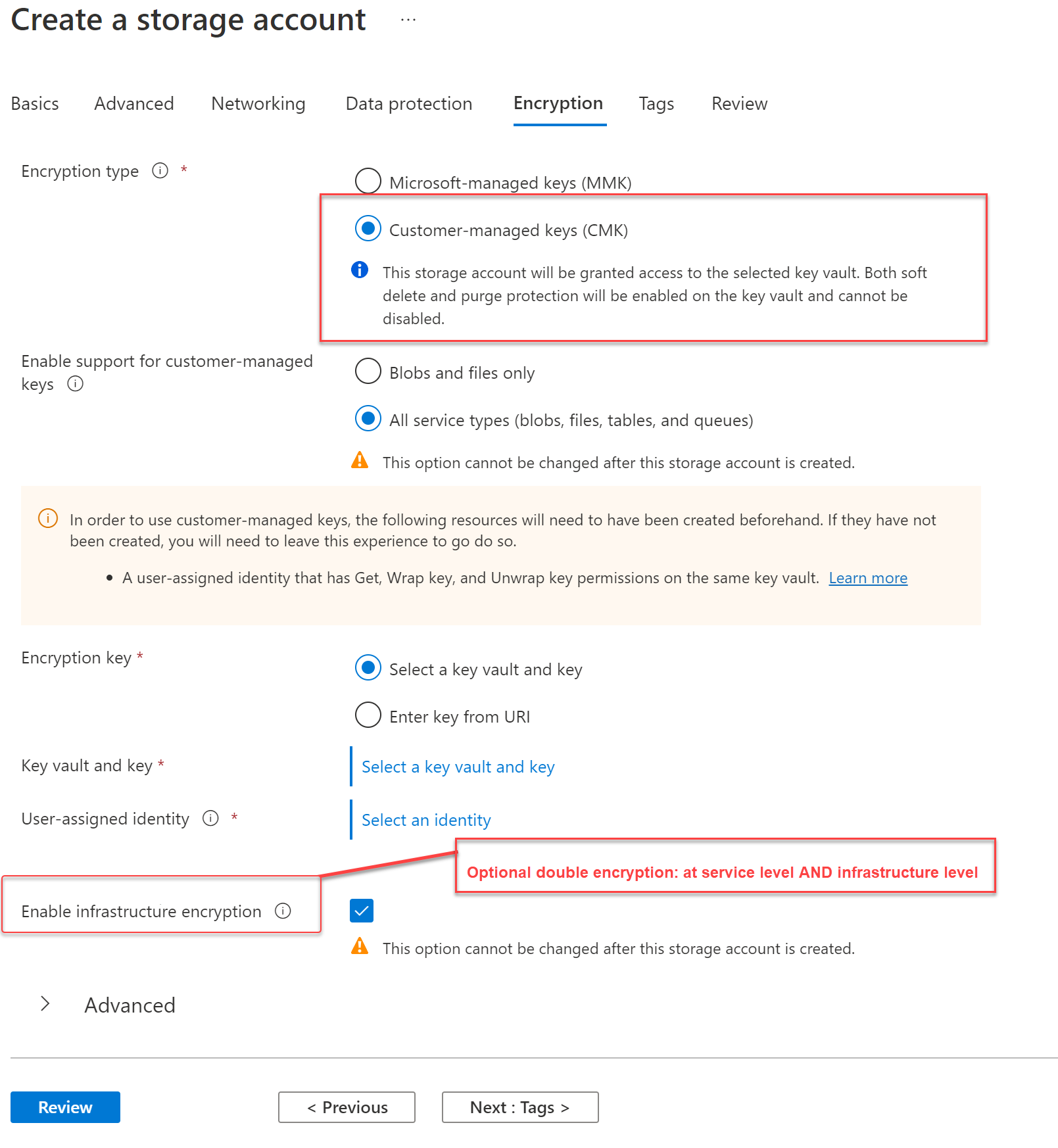 In order to utilize a customer-managed key for storage account encryption, you must enable it during account creation and you should have a Key Vault with Key and Managed Identity with appropriate permissions already provisioned. Optionally, 256-bit AES encryption at the Azure Storage infrastructure level can also be enabled.