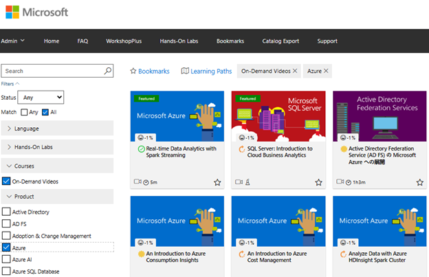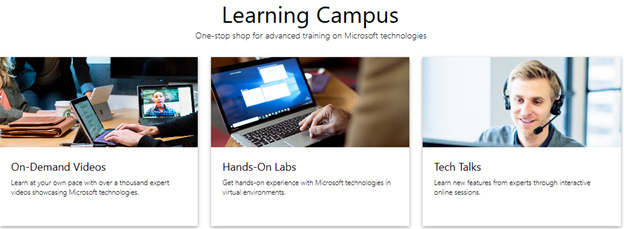 Du kan vælge: Demand Videos, Hands-On Labs og Tech Talks fra Learning Campus' forside, og derefter filtrere resultater baseret på sprog, laboratorietype, videoer eller filtrere efter Microsoft-produkt.