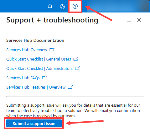 - Vælg spørgsmålstegnsikonet øverst på siden for at åbne siden Support & Fejlfinding.