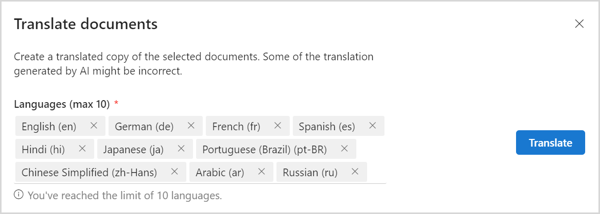 - Request multiple languages per translation: You can select up to 10 languages per document translation.