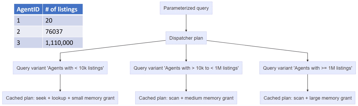 As a dispatcher plan evaluates the cardinality of predicates based on runtime parameter values, it bucketizes those values, and generates separate child queries to compile and execute. These child queries are called query variants. Query variants have their own plans in the plan cache and Query Store.
