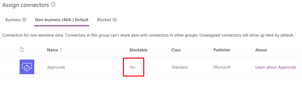 Connectors can now be added to one of the three groups that are available in DLP: Business, Non-Business, and Blocked. The Approvals connector can't be blocked; it can only be added to the Business or Non-Business group.