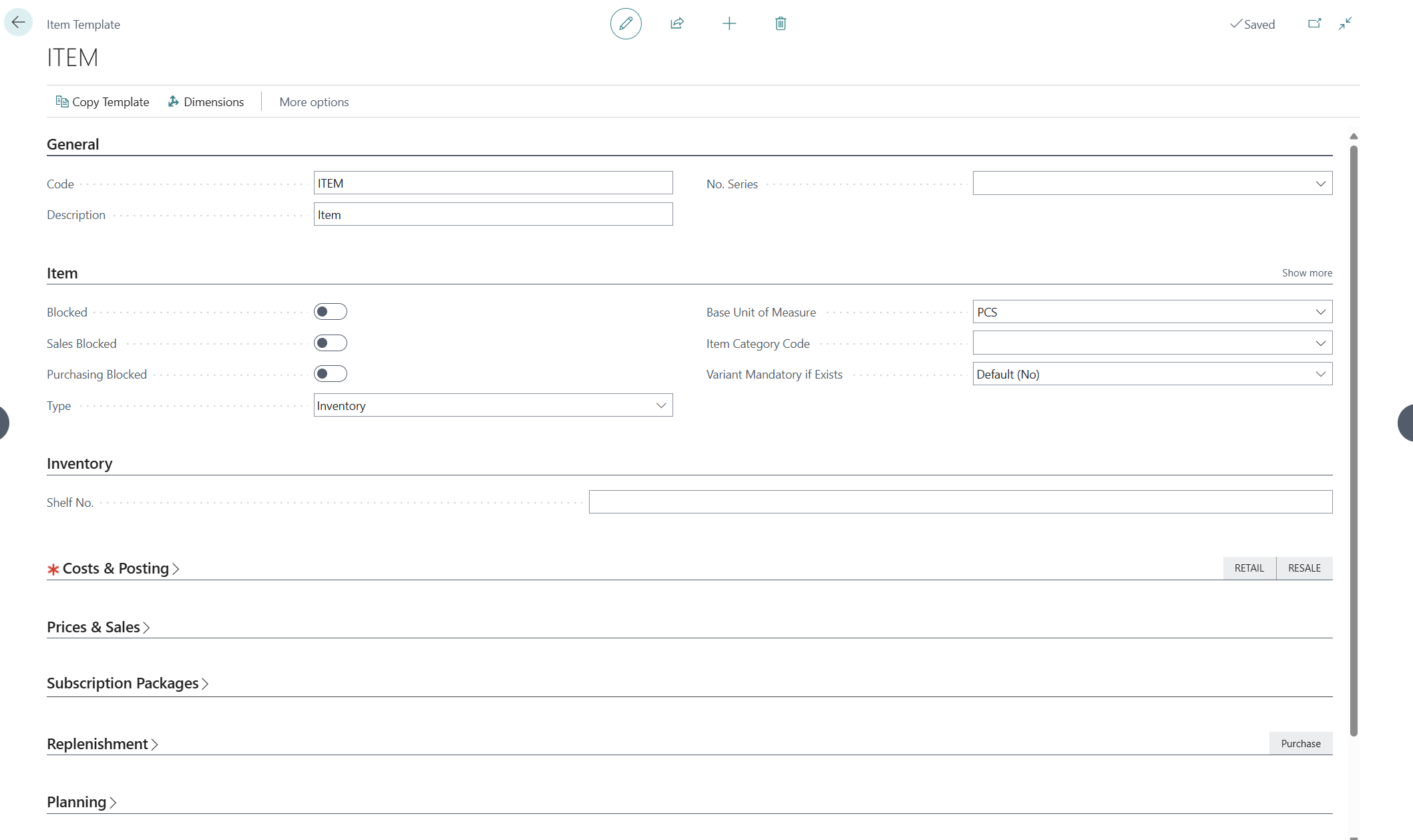 When you select a template, Business Central automatically enters the preconfigured values on the item card for the new item.