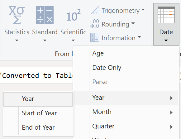 Når du er færdig med at vælge datotype , kan du tilføje kolonner for år, måneder, uger og dage. Gå til Tilføj kolonne, vælg rullemenuen under Dato, og vælg derefter År som vist i følgende figur.